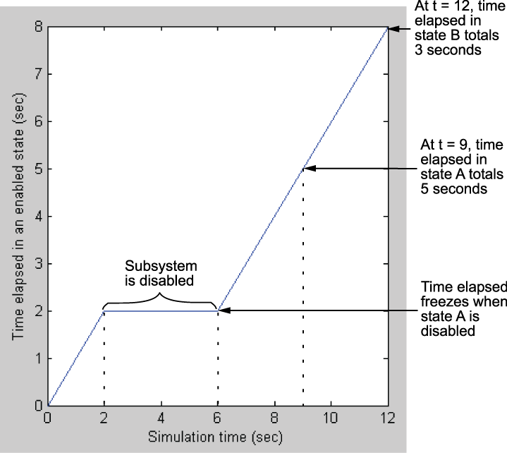 Этот график показывает, что общее время протекло в графике. Когда входной сигнал включает подсистему во время t = 0, A состояния становится активным. В то время как система включена, увеличения прошедшего времени. Когда подсистема отключена в t = 2, график засыпает, и прошедшее время прекращает увеличиваться. Для 2 <t <6, прошедшее время остается замороженным в 2 секунды, потому что система отключена. Когда график просыпается в t = 6, прошедшее время начинает увеличиваться снова.