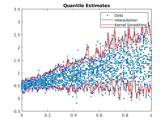 [sT,idx] = sort(t); figure; h1 = plot(t,y,'.'); hold on h2 = plot(sT,quantInterp(idx,:),'b'); h3 = plot(sT,quantKS(idx,:),'r'); legend([h1 h2(1) h3(1)],'Data','Interpolation','Kernel Smoothing'); title('Quantile Estimates') hold off