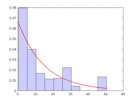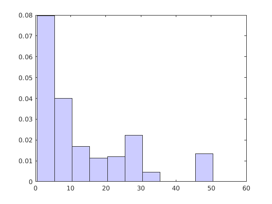 ecdfhist вычисляет высоты панели из увеличений эмпирической кумулятивной функции распределения, f, в точках оценки, x. Это нормирует высоты панели так, чтобы область гистограммы была равна 1. В отличие от этого histogram производит панели с высотами, представляющими количество интервалов.