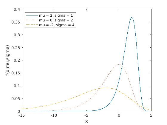 x = -15:.01:5; plot(x,evpdf(x,2,1),'-', ... x,evpdf(x,0,2),':', ... x,evpdf(x,-2,4),'-.'); legend({'mu = 2, sigma = 1', ... 'mu = 0, sigma = 2', ... 'mu = -2, sigma = 4'}, ... 'Location','NW') xlabel('x') ylabel('f(x|mu,sigma)')