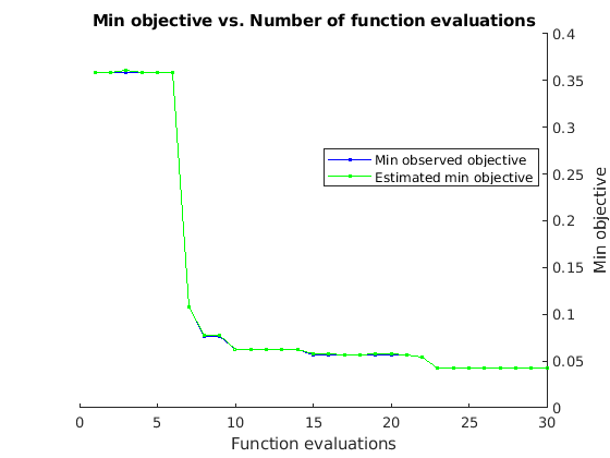 |=====================================================================================================| | Iter | Eval | Objective | Objective | BestSoFar | BestSoFar | KernelScale | Lambda | | | result | | runtime | (observed) | (estim.) | | | |=====================================================================================================| | 1 | Best | 0.35897 | 0.92665 | 0.35897 | 0.35897 | 64.836 | 4.4811e-06 | | 2 | Accept | 0.35897 | 4.6519 | 0.35897 | 0.35897 | 0.036335 | 0.015885 | | 3 | Accept | 0.39601 | 5.5965 | 0.35897 | 0.36053 | 0.0022147 | 6.8254e-06 | | 4 | Accept | 0.35897 | 1.0763 | 0.35897 | 0.35898 | 5.1259 | 0.28097 | | 5 | Accept | 0.35897 | 3.5904 | 0.35897 | 0.35897 | 0.24853 | 0.10828 | | 6 | Accept | 0.35897 | 0.74403 | 0.35897 | 0.35897 | 885.09 | 0.00057316 | | 7 | Best | 0.10826 | 3.5537 | 0.10826 | 0.10833 | 8.0346 | 0.0048286 | | 8 | Best | 0.076923 | 3.2422 | 0.076923 | 0.076999 | 7.0902 | 0.0034068 | | 9 | Accept | 0.091168 | 3.3186 | 0.076923 | 0.077059 | 9.1504 | 0.0020604 | | 10 | Best | 0.062678 | 3.9429 | 0.062678 | 0.062723 | 3.5487 | 0.0025912 | | 11 | Accept | 0.062678 | 3.2212 | 0.062678 | 0.062741 | 2.3869 | 0.003321 | | 12 | Accept | 0.41026 | 3.1638 | 0.062678 | 0.062536 | 0.14075 | 0.0022499 | | 13 | Accept | 0.062678 | 3.3683 | 0.062678 | 0.062532 | 3.4215 | 0.0036803 | | 14 | Accept | 0.062678 | 4.2194 | 0.062678 | 0.061956 | 3.2928 | 0.0030533 | | 15 | Best | 0.05698 | 2.6177 | 0.05698 | 0.057204 | 5.0598 | 0.0025499 | | 16 | Accept | 0.062678 | 5.4455 | 0.05698 | 0.057186 | 5.3401 | 0.0015096 | | 17 | Accept | 0.05698 | 4.4441 | 0.05698 | 0.057118 | 1.813 | 0.0069209 | | 18 | Accept | 0.059829 | 4.0439 | 0.05698 | 0.057092 | 1.5122 | 0.0046637 | | 19 | Accept | 0.059829 | 4.2654 | 0.05698 | 0.05718 | 1.9277 | 0.0056364 | | 20 | Accept | 0.065527 | 3.8732 | 0.05698 | 0.057189 | 1.4064 | 0.0094306 | |=====================================================================================================| | Iter | Eval | Objective | Objective | BestSoFar | BestSoFar | KernelScale | Lambda | | | result | | runtime | (observed) | (estim.) | | | |=====================================================================================================| | 21 | Accept | 0.05698 | 5.1486 | 0.05698 | 0.057033 | 5.1719 | 0.0023614 | | 22 | Best | 0.054131 | 12.263 | 0.054131 | 0.054176 | 1.9618 | 6.5704e-05 | | 23 | Best | 0.042735 | 5.0079 | 0.042735 | 0.042763 | 1.9463 | 1.0169e-05 | | 24 | Accept | 0.082621 | 5.1015 | 0.042735 | 0.042775 | 1.0661 | 1.3245e-05 | | 25 | Accept | 0.054131 | 10.538 | 0.042735 | 0.042789 | 3.288 | 2.0035e-05 | | 26 | Accept | 0.062678 | 5.7598 | 0.042735 | 0.042769 | 2.657 | 3.0334e-06 | | 27 | Accept | 0.059829 | 7.2348 | 0.042735 | 0.043054 | 2.0381 | 1.9791e-05 | | 28 | Accept | 0.042735 | 9.0399 | 0.042735 | 0.042764 | 3.5043 | 0.0001237 | | 29 | Accept | 0.054131 | 5.0304 | 0.042735 | 0.042764 | 1.3897 | 3.2288e-06 | | 30 | Accept | 0.062678 | 7.0101 | 0.042735 | 0.042792 | 2.2414 | 0.0002259 |