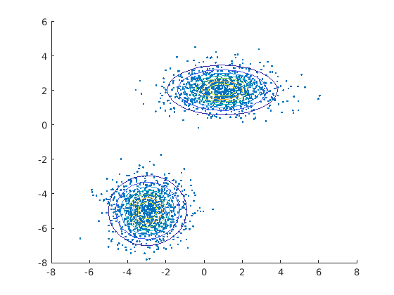 mu1 = [1 2]; % Mean of the 1st component sigma1 = [2 0; 0 .5]; % Covariance of the 1st component mu2 = [-3 -5]; % Mean of the 2nd component sigma2 = [1 0; 0 1]; % Covariance of the 2nd component