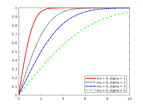 figure; plot(x,cdf1,'r','LineWidth',2) hold on; plot(x,cdf2,'k:','LineWidth',2); plot(x,cdf3,'b-.','LineWidth',2); plot(x,cdf4,'g--','LineWidth',2); legend({'mu = 0, sigma = 1','mu = 0, sigma = 2',... 'mu = 0, sigma = 3','mu = 0, sigma = 5'},'Location','SE'); hold off;