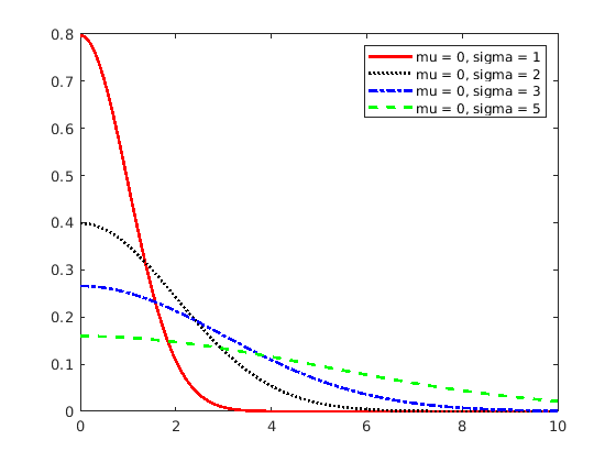 figure; plot(x,pdf1,'r','LineWidth',2) hold on; plot(x,pdf2,'k:','LineWidth',2); plot(x,pdf3,'b-.','LineWidth',2); plot(x,pdf4,'g--','LineWidth',2); legend({'mu = 0, sigma = 1','mu = 0, sigma = 2',... 'mu = 0, sigma = 3','mu = 0, sigma = 5'},'Location','NE'); hold off;