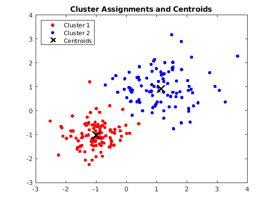 figure; plot(X(idx==1,1),X(idx==1,2),'r.','MarkerSize',12) hold on plot(X(idx==2,1),X(idx==2,2),'b.','MarkerSize',12) plot(C(:,1),C(:,2),'kx',... 'MarkerSize',15,'LineWidth',3) legend('Cluster 1','Cluster 2','Centroids',... 'Location','NW') title 'Cluster Assignments and Centroids' hold off