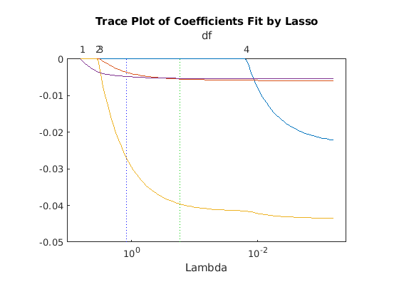 Когда вы активируете Data Cursor и кликаете по графику, вы видите имя предиктора, коэффициента, значения Lambda, и индекс той точки, означая столбец в b сопоставленный с той подгонкой.
