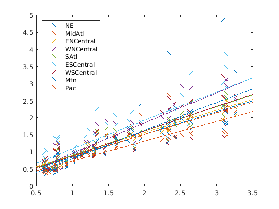 B = [beta(1:d)';beta(d+1:end)']; xx = linspace(.5,3.5)'; fits = [ones(size(xx)),xx]*B; figure; h = plot(x,Y,'x',xx,fits,'-'); for i = 1:d set(h(d+i),'color',get(h(i),'color')); end regions = flu.Properties.VarNames(2:end-1); legend(regions,'Location','NorthWest');