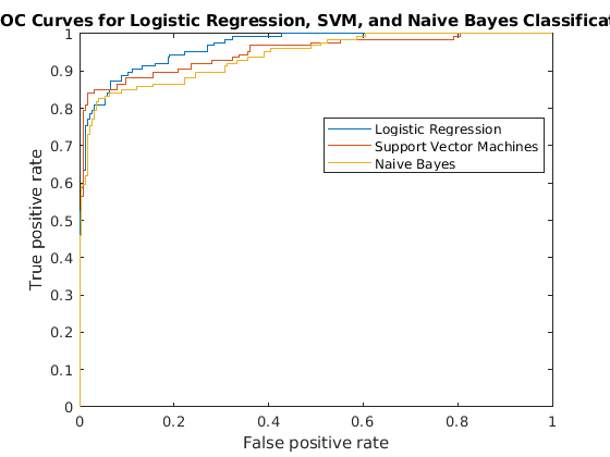 plot(Xlog,Ylog) hold on plot(Xsvm,Ysvm) plot(Xnb,Ynb) legend('Logistic Regression','Support Vector Machines','Naive Bayes','Location','Best') xlabel('False positive rate'); ylabel('True positive rate'); title('ROC Curves for Logistic Regression, SVM, and Naive Bayes Classification') hold off