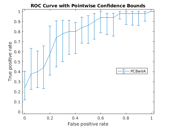 Вертикальное усреднение (VA) — perfcurve оценочные доверительные границы на Y и T в фиксированных значениях X. Таким образом, perfcurve берет выборки кривых ROC для фиксированного X значения, составляет в среднем соответствующий Y и T значения, и вычисляют стандартные погрешности. Можно использовать XVals аргумент пары "имя-значение", чтобы зафиксировать X значения для вычислительных доверительных границ. Если вы не задаете XValsто perfcurve вычисляет доверительные границы во всем X значения.