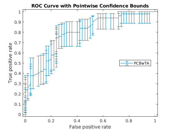 Если perfcurve вычисляет доверительные границы с помощью вертикального усреднения, AUC вектор 3 на 1. Первый столбец AUC содержит среднее значение. Вторые и третьи столбцы содержат нижнюю границу и верхнюю границу, соответственно, доверительной границы.