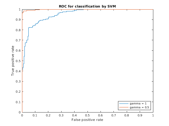 plot(x1,y1) hold on plot(x2,y2) hold off legend('gamma = 1','gamma = 0.5','Location','SE'); xlabel('False positive rate'); ylabel('True positive rate'); title('ROC for classification by SVM');