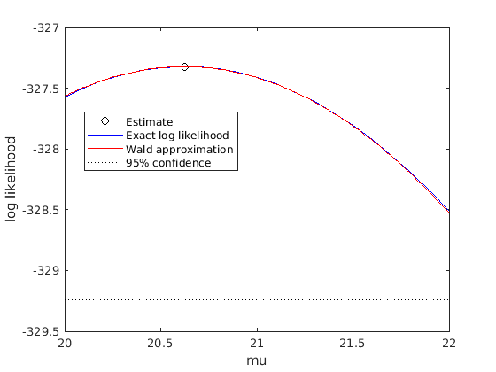 Первый столбец содержит логарифмическое значение вероятности, которое соответствует оценке mu во втором столбце. Логарифмическая вероятность максимизируется между значениями параметров 20.6000 и 20.7000, соответствующий, чтобы регистрировать значения вероятности-327.3223 и-327.3257. Третий столбец содержит значение k это максимизирует соответствующую логарифмическую вероятность для mu. Четвертый столбец содержит значение sigma это максимизирует соответствующую логарифмическую вероятность для mu.