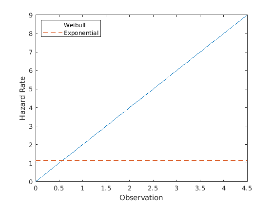 plot(t,h1,'-',t,h2,'--') xlabel('Observation') ylabel('Hazard Rate') legend('Weibull','Exponential','location','northwest')