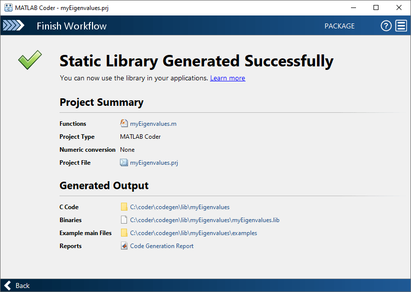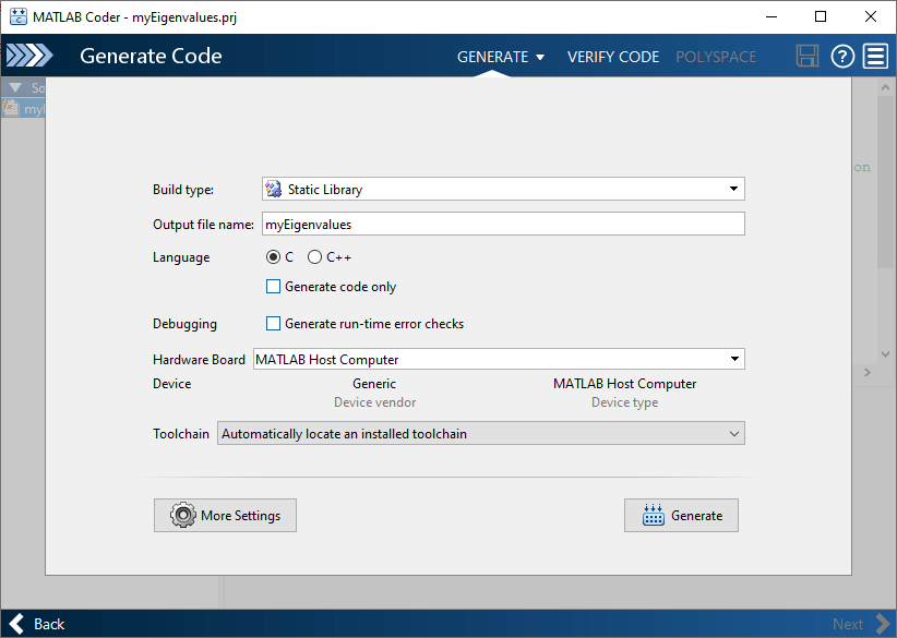 В диалоговом окне Generate, типе Сборки набора к Static Library(.lib) и Язык к C. Используйте значения по умолчанию для других настроек конфигурации сборки проекта. Вместо того, чтобы генерировать статическую библиотеку C, можно принять решение сгенерировать MEX-функцию или другие типы сборки C/C++. Различные настройки проекта доступны для MEX и типов сборки C/C++. Когда вы переключаетесь между MEX и генерацией кода C/C++, проверяете настройки, которые вы выбираете.