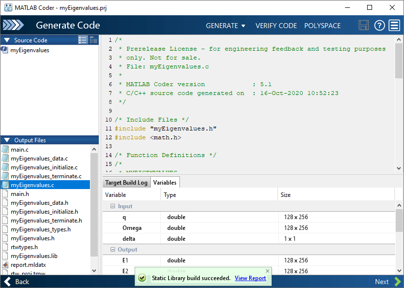 Нажмите Generate. MATLAB Coder генерирует автономную статическую библиотеку C, myEigenvalues, в папке work\codegen\lib\myEigenvalues. Папка work местоположение myEigenvalues.m и myTest.m. Приложение MATLAB Coder указывает, когда генерация кода успешно выполнилась. Это отображает исходные файлы MATLAB и сгенерированные выходные файлы на левой стороне страницы. На вкладке Variables это отображает информацию об исходных переменных MATLAB. На вкладке Target Build Log это отображает журнал сборки, включая предупреждения компилятора C/C++ и ошибки. По умолчанию окно кода отображает файл исходного кода C, myEigenvalues.c. Чтобы просмотреть различный файл, кликните по желаемому имени файла в панели Файлов исходного кода или Выходных файлов.
