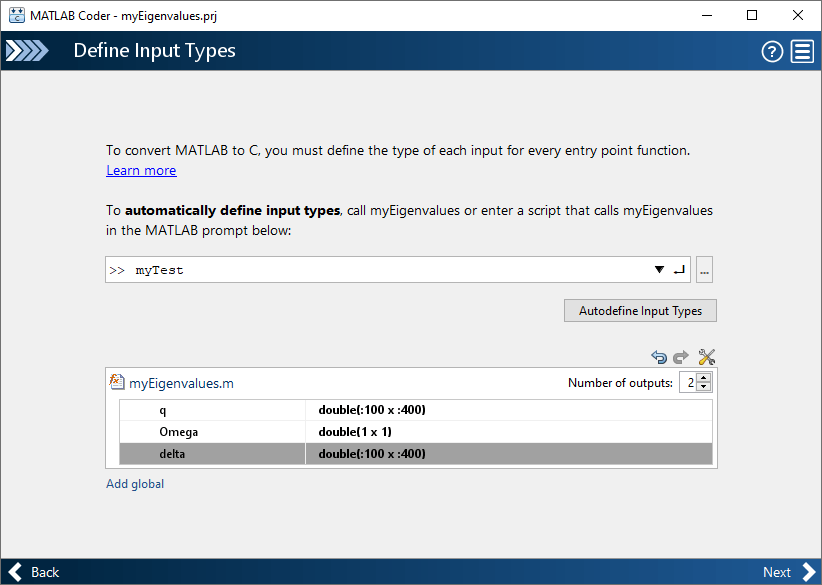 Нажмите Autodefine Input Types. Тестовый файл, myTest.m, вызывает функцию точки входа, myEigenvalues, с ожидаемыми входными типами. Приложение решает что вход q double(128 x 256), вход Omega double(128 x 256), и вход delta double(1 x 1).