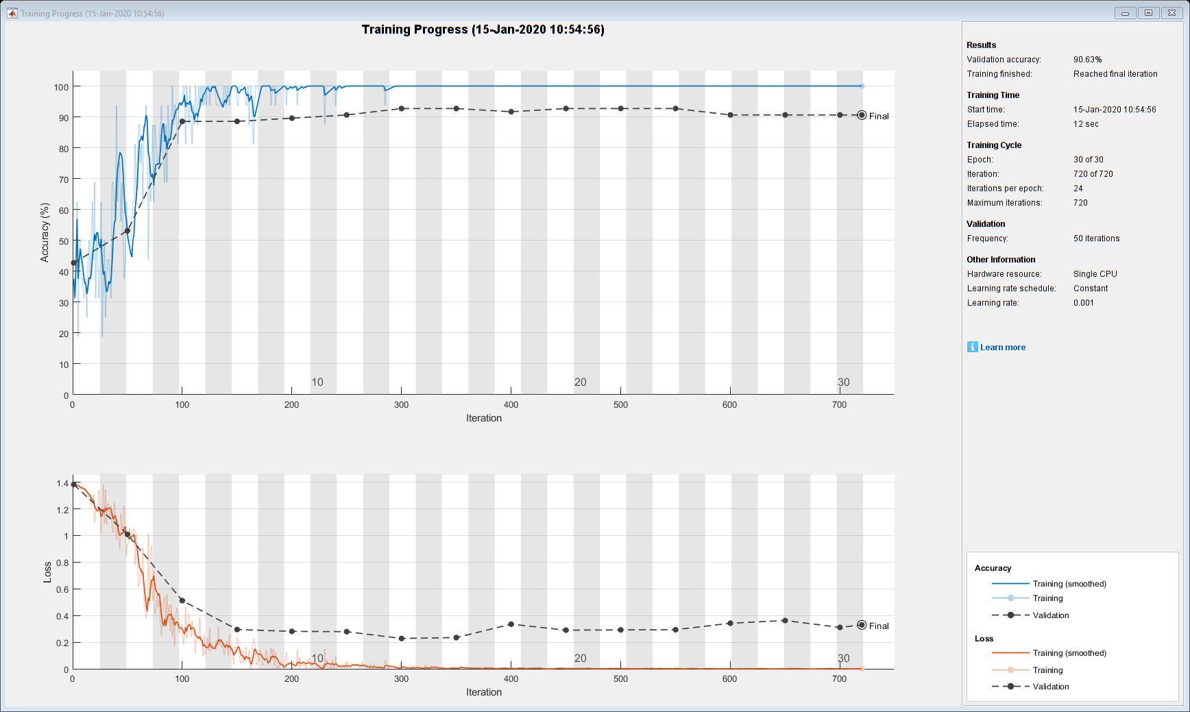options = trainingOptions('adam', ... 'MiniBatchSize',16, ... 'GradientThreshold',2, ... 'Shuffle','every-epoch', ... 'ValidationData',{XValidation,YValidation}, ... 'Plots','training-progress', ... 'Verbose',false);