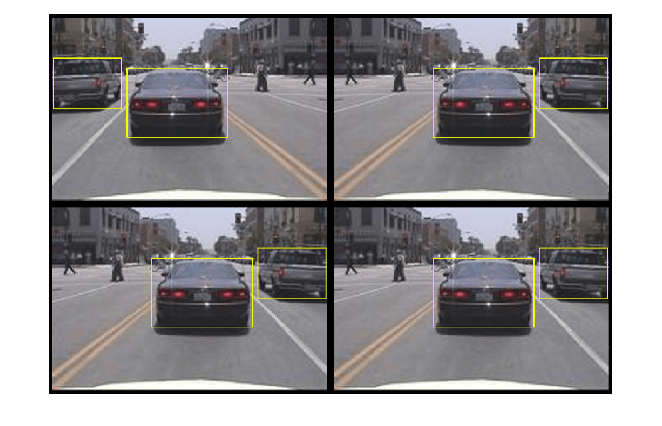 augmentedData = cell(4,1); for k = 1:4 data = read(augmentedTrainingData); augmentedData{k} = insertShape(data{1},'Rectangle',data{2}); reset(augmentedTrainingData); end figure montage(augmentedData,'BorderSize',10)