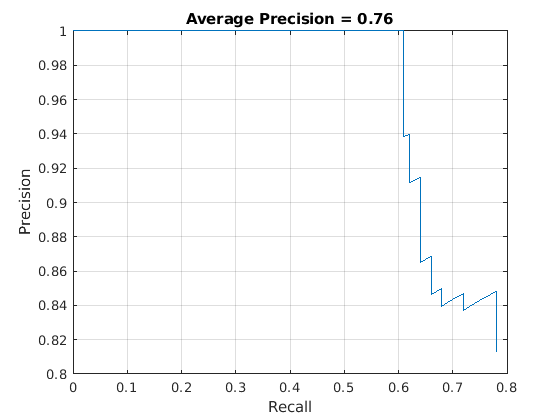 figure plot(recall,precision) xlabel('Recall') ylabel('Precision') grid on title(sprintf('Average Precision = %.2f', ap))