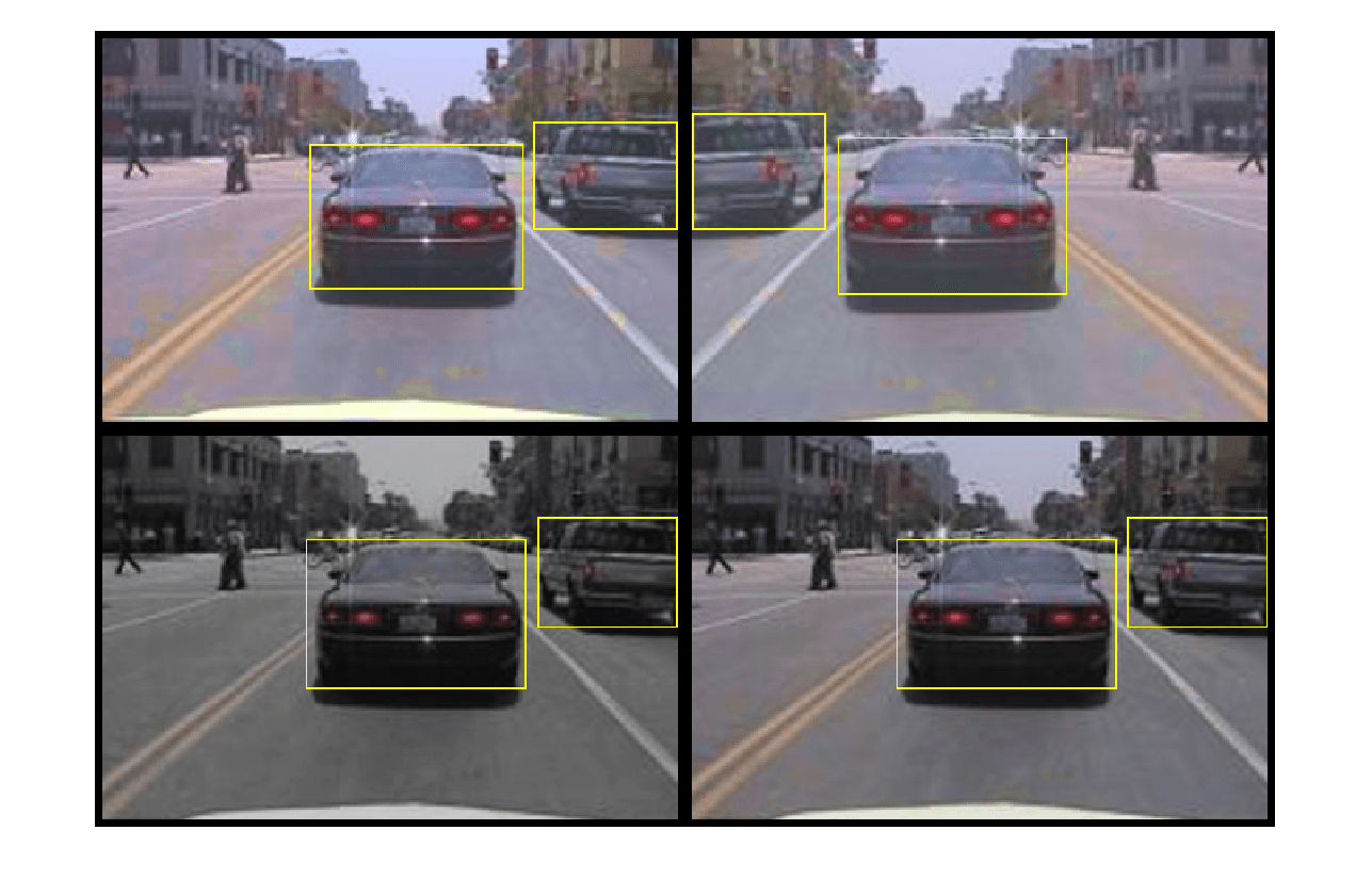 augmentedData = cell(4,1); for k = 1:4 data = read(augmentedTrainingData); augmentedData{k} = insertShape(data{1},'Rectangle',data{2}); reset(augmentedTrainingData); end figure montage(augmentedData,'BorderSize',10)