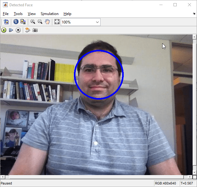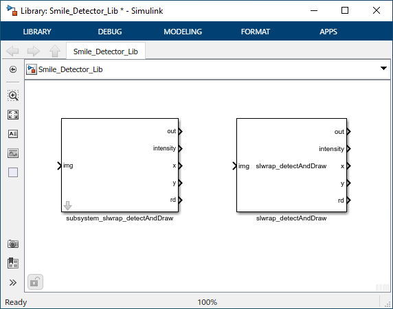 Библиотека Simulink Smile_Detector_Lib создается из вашего кода OpenCV в корневую папку проекта. Библиотека содержит подсистему и блок C Caller. Можно использовать любой из этих блоков для симуляции модели. В этом примере, подсистема subsystem_slwrap_detectAndDraw используется.