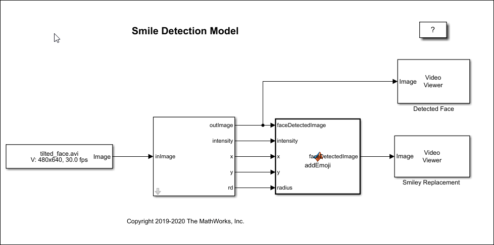 Сначала импортируйте функцию OpenCV в Simulink® при помощи Установки и Использования Интерфейс Computer Vision Toolbox для OpenCV в Simulink. Мастер создает Библиотеку Simulink, которая содержит подсистему и блок C Caller для заданной функции OpenCV. Подсистема затем используется в предварительно сконфигурированной модели Simulink, чтобы принять лицевое изображение или видео для обнаружения улыбки. Можно сгенерировать Код С++ из модели, и затем развернуть код по целевому компьютеру.