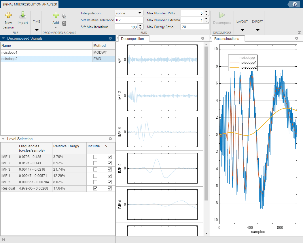 Приложение Signal Multiresolution Analyzer является интерактивным инструментом для визуализации многоуровневого вейвлета и эмпирических разложений моды 1D сигналов с действительным знаком и сравнения результатов. С приложением вы можете: