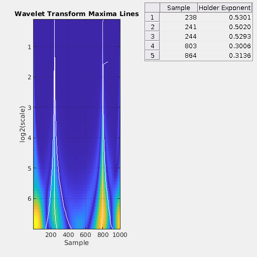wtmm(___,'ScalingExponent','local') без выходных аргументов строит графики максимумов вейвлета в текущей фигуре. Оценки локальных экспонент Держателя отображены в таблице справа от графика.