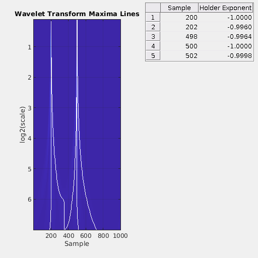 Для сигналов с несколькими подобной острому выступу сингулярностью и экспонентами Держателя, которые имеют большое изменение, вы устанавливаете алгоритм возвращать локальные экспоненты Держателя, которые вводят отдельные значения для каждой сингулярности. Для сигналов с многочисленными экспонентами Держателя, которые имеют относительно маленькие изменения, вы устанавливаете алгоритм возвращать глобальную экспоненту Держателя. Глобальная экспонента Держателя применяется к целому сигналу. Для сигналов со многой сингулярностью можно сократить количество максимумов, найденных путем ограничения алгоритма, чтобы запуститься в или регресс к определенной минимальной или максимальной шкале, соответственно. Для получения дальнейшей информации о WTMM, см. [1] и [3].