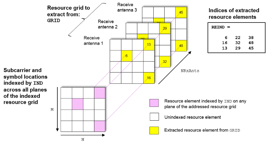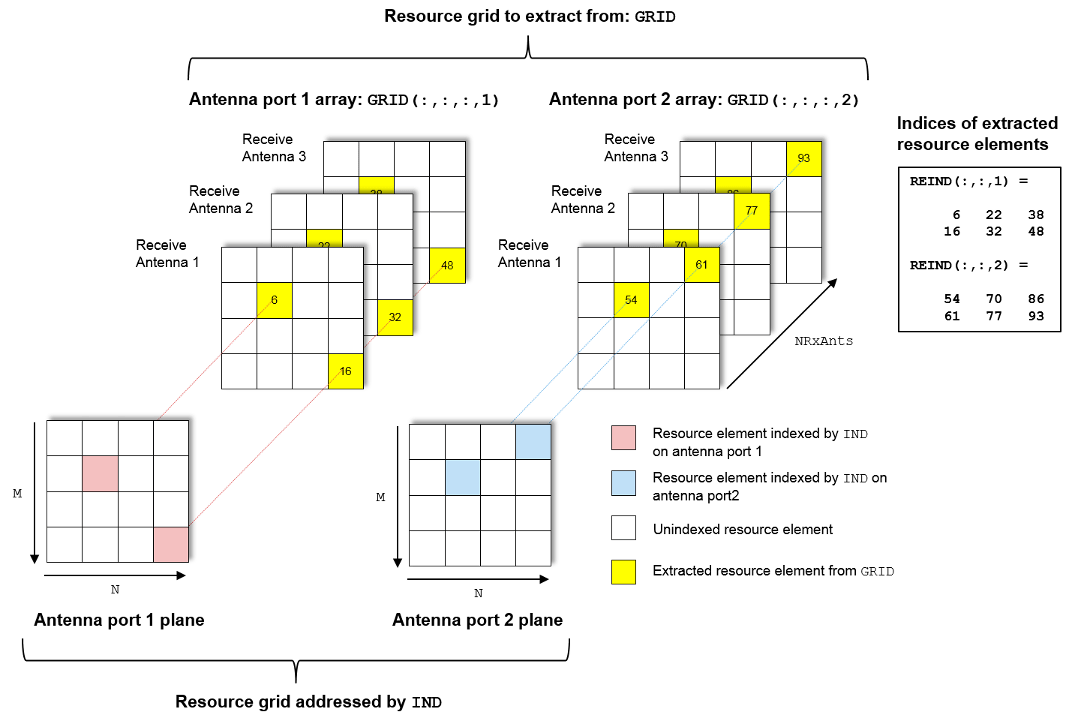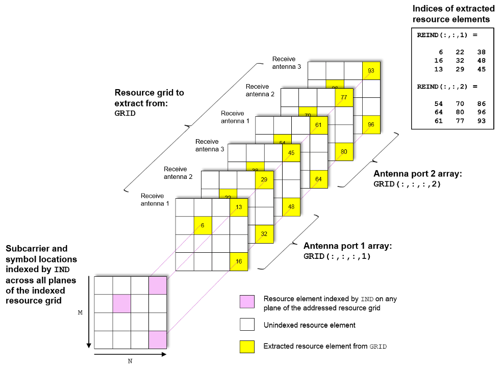 Обычно специфичные для канала или сигнала функции генерируют индексы элемента ресурса для отображения символов канала или сигнала в сетку ресурсов. Индексы адресуют элементы ресурсов в массиве M-by-N-by-P. M - количество поднесущих, N - количество символов OFDM, и P - количество антенных портов.