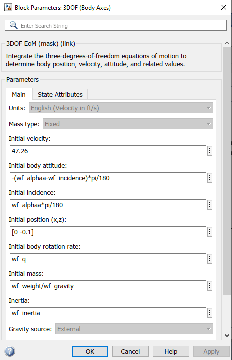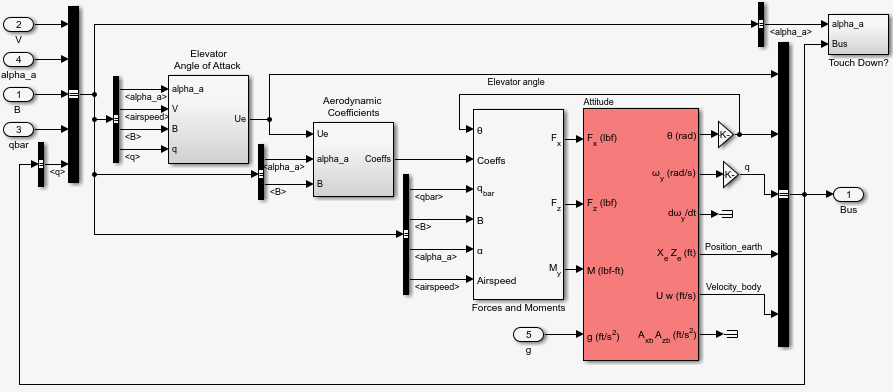 Блок 3DOF (Body Axes) использует уравнения движения для определения линейного и углового движения планера Wright Flyer. Он также выполняет преобразования из системы осей исходной модели и осей тела.