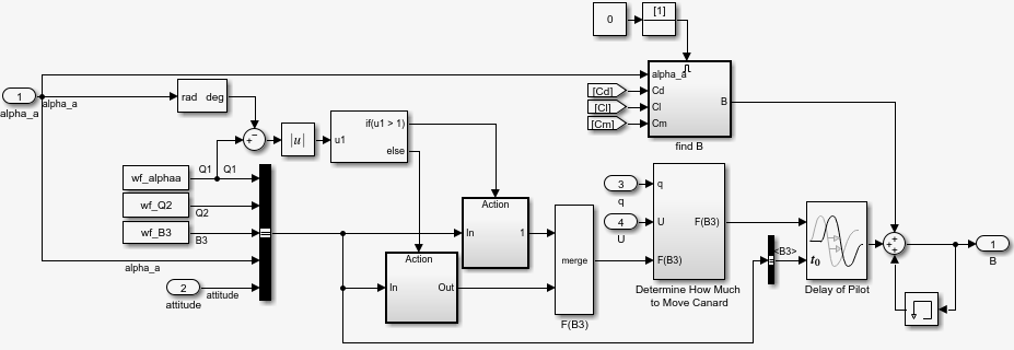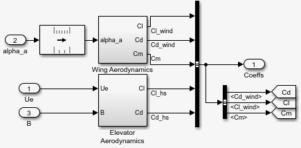 Подсистема «Аэродинамические коэффициенты» содержит аэродинамические данные и уравнения для вычисления аэродинамических коэффициентов, которые суммируются и передаются в подсистему «Силы и моменты». Хранящиеся в наборах данных аэродинамические коэффициенты определяются интерполяцией с использованием блоков Прелукапа.