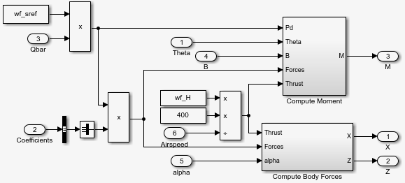 Аэродинамические силы и моменты, действующие на корпус самолета, формируются из аэродинамических коэффициентов. Подсистема Силы и моменты вычисляет силы тела и моменты тела, действующие на планер вокруг центра тяжести. Эти силы и моменты зависят от аэродинамических коэффициентов, тяги, динамического давления и эталонных параметров планера.