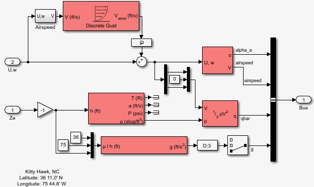 Подсистема Environment модели Wright Flyer содержит множество блоков из библиотеки Environment программного обеспечения Aerospace Blockset™, включая ветер, атмосферу и гравитацию, и вычисляет воздушную скорость и динамическое давление. Блок дискретной модели порыва ветра обеспечивает порывы ветра в моделируемую среду. Остальные блоки: