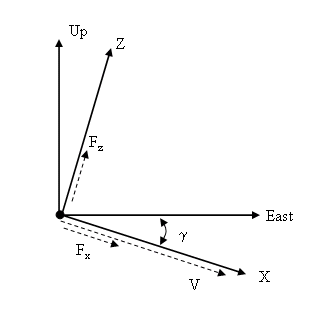 Поступательные движения точечной массы [XEastXUp] T являются функциями скорости полета (V) и угла траектории полета (γ ),