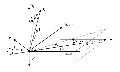 Прикладываемые силы [FxFyFh] T находятся в системе и определяются осью x в направлении скорости транспортного средства относительно воздуха, ось Z - вверх и ось Y - завершает правостороннюю раму и являются функциями подъема (L), сопротивления (D), тяги (T), веса (W), угла (γ) траектории полета, угла атаки (α) и угла крена