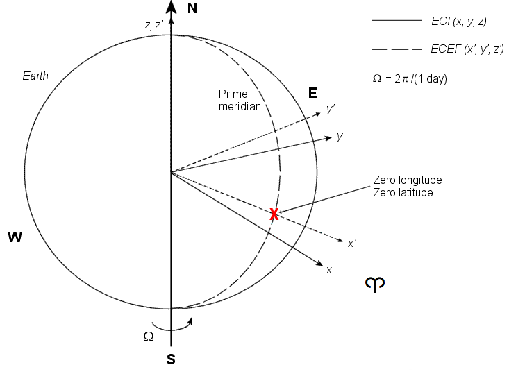 Система Земля-центр, Земля-фиксированная (ECEF) неинерционна и вращается вместе с Землей. Его начало зафиксировано в центре Земли (см. предыдущий рисунок).