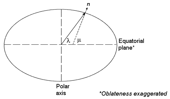 Геодезическая широта на поверхности Земли определяется углом, усеченным вектором нормали поверхности n и экваториальной плоскостью.