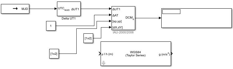 Эта модель показывает, как блок ECI-ECEF матрицы Cosine направления использует выходные данные блоков Delta UT1 и Julian Data Conversion для получения разности между UTC и Universal Time (UT1).