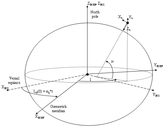 Начало координат ECEF - это центр Земли. Кроме того, предполагается, что интересующее тело является жестким, что исключает необходимость учитывать силы, действующие между отдельными элементами массы. Представление вращения кадра ECEF от кадра ECI упрощается, чтобы учитывать только постоянное вращение эллипсоида Земли (starte), включая начальную небесную долготу (LG (0 )).