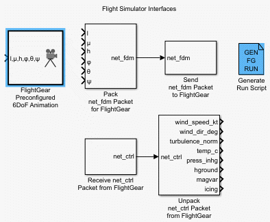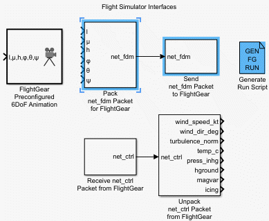 FlightGear, Предварительно сконфигурированный 6DoF, блок Анимации - подсистема, содержащая Пакет net_fdm Пакет для FlightGear, и Пошлите net_fdm Пакет в блоки FlightGear:
