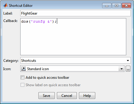 Если компьютер обладает достаточной вычислительной мощностью для одновременного запуска как программного обеспечения Simulink, так и FlireGear, простой способ запуска FlireGear в системе Windows состоит в создании кнопки рабочего стола MATLAB, содержащей следующую команду для выполнения сценария запуска, подобного созданному выше:
