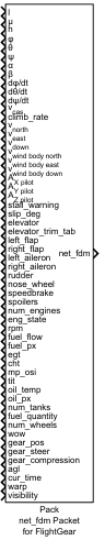 Блок Pack net_fdm Packet for FlireGear форматирует двоичную структуру, совместимую с FlireGear, из входных данных модели. В конфигурации по умолчанию блок отображает только 6DoF порты, но можно настроить полный интерфейс FlireGear, поддерживающий более 50 различных сигналов из диалогового окна блока: