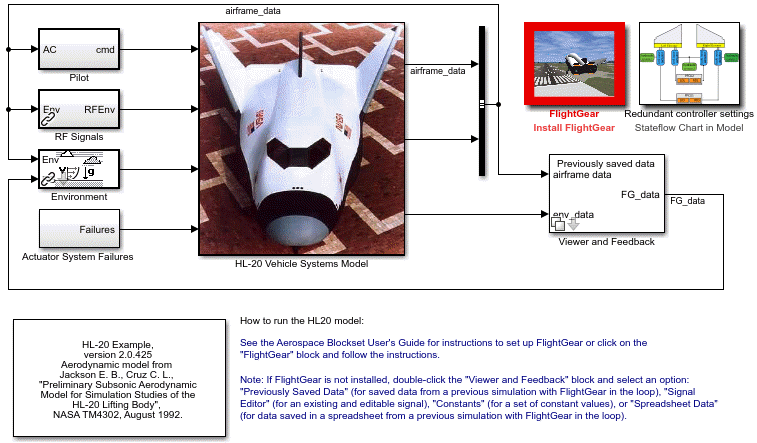 Программное обеспечение Aerospace Blockset содержит пример модели подъемного кузова HL-20, использующего интерфейс FlireGear и проекты. Этот пример иллюстрирует многие функции программного обеспечения Aerospace Blockset. Он также содержит блок Variant Subsystem, который можно использовать для указания источника данных для моделирования. Для изменения источника данных рельефа местности может потребоваться использовать блок «Variant Subsystem», а для моделирования модели - нет.