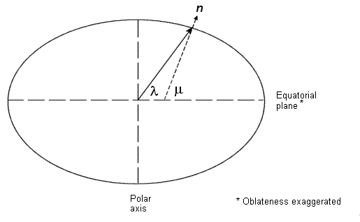 Геодезическая широта λ на поверхности Земли определяется углом, усеченным вектором нормали поверхности. n и экваториальной плоскости.
