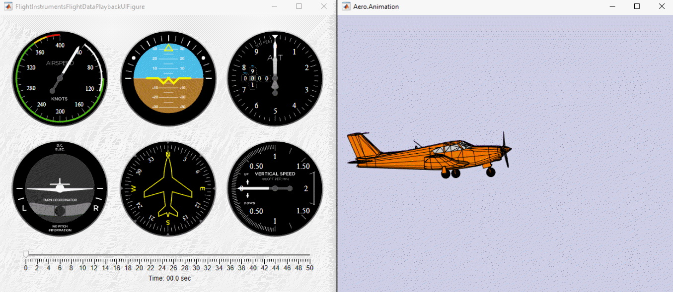 В этом примере используется Aero.Animation объект для визуализации состояния полета летательного аппарата во времени. Чтобы задать текущее время, добавьте устройство ввода времени, например ползунок или ручку. При изменении времени на устройстве ввода времени компоненты летного прибора и окно анимации обновляются для отображения результатов. Более подробная информация содержится в примере кода.