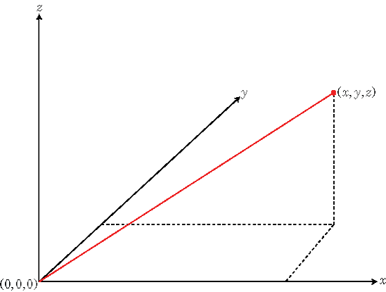 Евклидова норма даёт длину вектора, измеренную от начала координат, как гипотенузу прямого треугольника. Расстояние между двумя векторами [x0 y0 z0] и [x1 y1 z1] составляет: