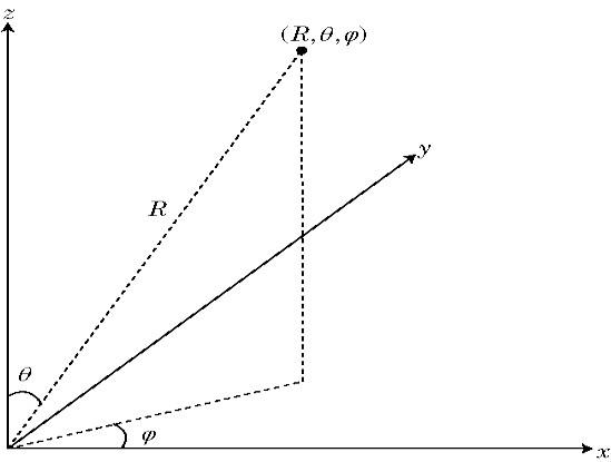 Сферическая система координат определяет вектор или точку в пространстве с расстоянием R и двумя углами. Можно представить углы в этой системе координат: