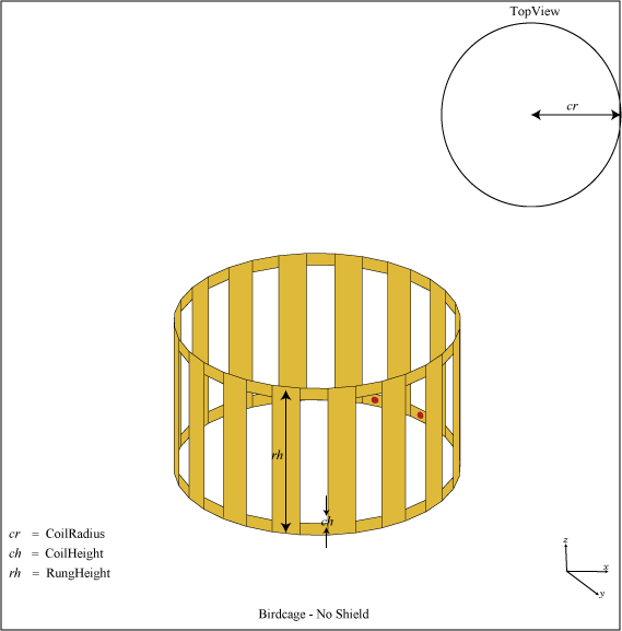 birdcage объект создает для создания катушки МРТ птичьей клетки. Эта антенна чаще всего используется в клинической МРТ. Антенная структура состоит из двух кольцевых катушек, соединенных проводящими элементами, называемыми rungs. Число звеньев зависит от размера катушки и обычно является четным числом.