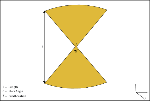 bowtieRounded объект представляет собой плоскую антенну bowtie, со скругленными краями, на плоскости Y-Z. Округленная чаша по умолчанию подается по центру. Точка подачи совпадает с началом координат. Начало координат расположено на плоскости Y-Z.
